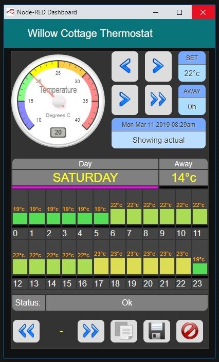 Here below is the stat as it appears online (only via PIVPN, deliberately). The TOP green readout is high resolution but I’m only actually using integer resolution – why bother being SO accurate when the difference in temperatures is well over 1 degree from 1 metre above ground to 1.5m and from one side of the room to the other. There IS however a use for the more accurate reading, as turning the heat off when the stat reaches set temperature means it will only ever stay AT the set temperature for a few moments.