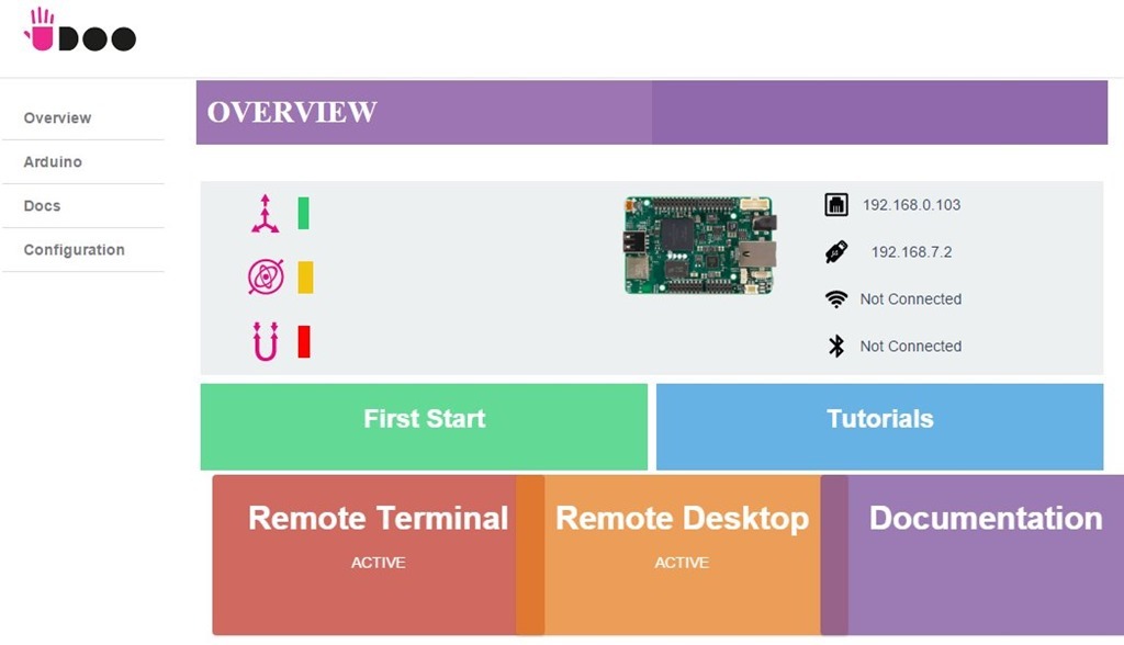 THEN I noticed on the side of the box, an instruction – just type “udooneo.local” – that wasn’t going to work or it would have shown up on my router. I tried – nothing – but I thought – why not give the IP address a shot. Bingo. “Your UDOO Neo will be available in your Network. You can now use it using SSH Remote Terminal, VNC Remote Desktop or trough Web Control Panel.” The problem is I STILL didn’t know the password. Attempts to click on the links associated with VNC and SSH brought back “404 not found” errors. Clearly, this is still in its early stages. On the one hand, they want you to use this in headless mode – and I’m all for that – but maybe putting the password on this page or on the box might’ve been good!