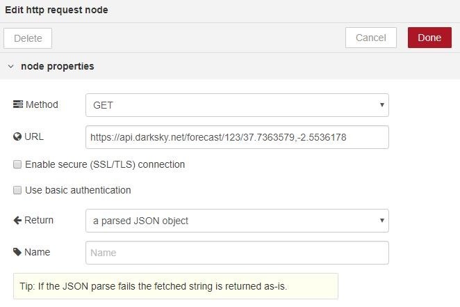 Above you see the setup to get the forecast… where it says 123 you would need your own (free) key and those are my longitude and latitude values straight from Google Maps. The function on the end – simply does this.. global.set(“weather”,msg.payload);