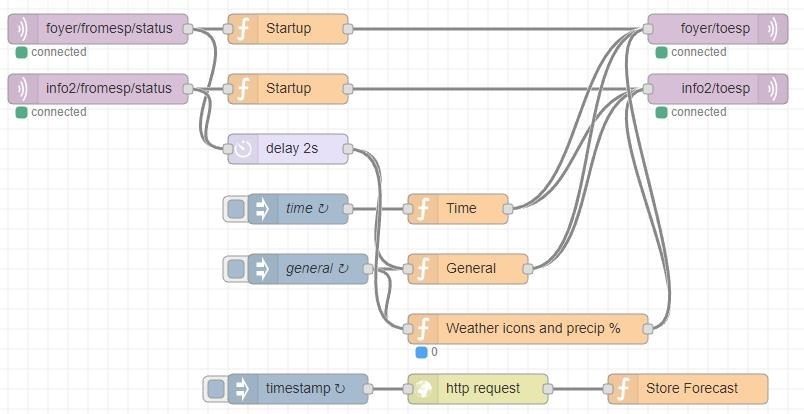 Above you see the Node-Red code, running on a Raspberry Pi using my usual setup – there are in fact 2 displays – one on my desk and one in the hallway. I check for the ESP12s coming out of reset and send start-up code via MQTT to the displays separately. Overkill, could have just done the one. That includes setting up the display itself, clearing the screen and putting in that nice white framework of lines and rectangles. Meanwhile I have timed functions updating the time (once a second) and everything else once a minute. The weather forecast (see icons in a previous post) comes from Dark Sky and I was having difficulty getting what I wanted out of the Node for that service, when it occurred to me that was just as easy to do an HTTP request – as the HTTP node is able to capture information and convert it to a JSON object. How handy is that.