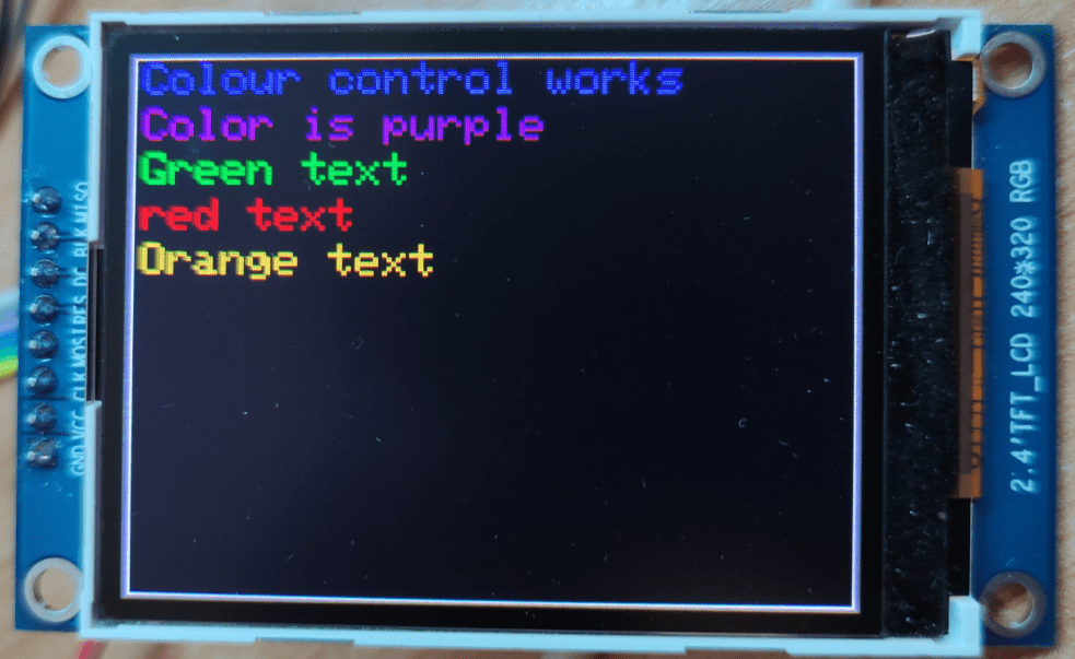 Note the ILI9341 CS and DC settings – the SPI versions don’t work – see above and this works. Also, CS is not used on these boards but needs to be defined in Tasmota or it won’t recognise the display. In the end, easier done than written about so here we go – 4 lines and some coloured text. The software also does boxes and circles.