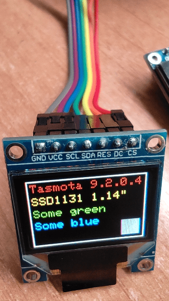 DisplayText [zf0C64536r96:64C3x3y3C63488]Tasmota 9.2.0.4[x3y15C65504f0]SSD1131 1.14"[x3y27C1984]Some green[x3y39C31]Some blue[x76y44C30735R16:16]