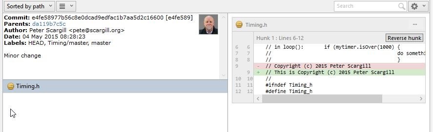From that point on it got easier. I tried making a local change to the “Timing.h” file and almost immediately the program noticed the change. Two things need to be done at this point. One “stages” the changed files – then “commits” them. Thankfully this can all be done in one simple command – i.e. a couple of button presses. This is of course local – you then have to “push” the files – but then this is just two button presses.