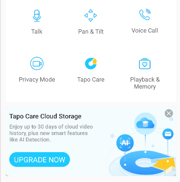 Options onscreen included the usual – “talk”, “pan & tilt”, “voice call”, “privacy mode”, “Tapo Care”.