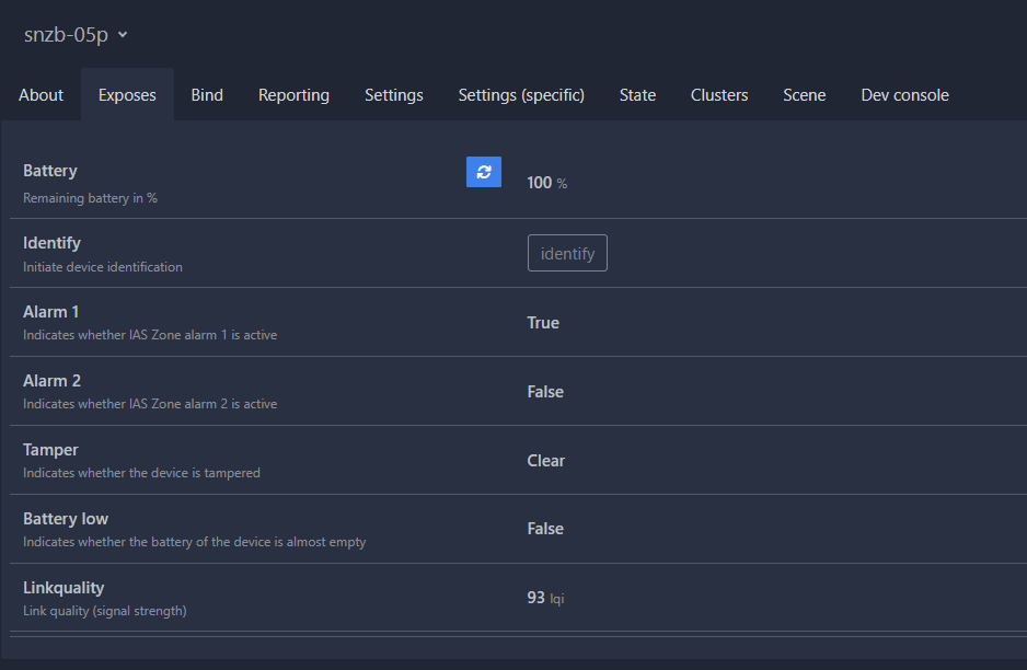 Ok, SNZB-05P paired with Zigbee2MQTT. I last updated my Zigbee2MQTT a few days ago – and the response to this unit is “unsupported” – not surprising as it is new – HOWEVER despite that it does accept the unit – see the image below – wet finger across the two contacts – and I get a response immediately – see ALARM 1 below in the Zigbee1MQTT web UI.