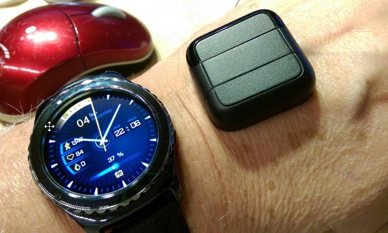 Here it is seen photographed next to my Samsung Gear Classic watch on my normal size hand to put it into perspective. I have the black one but there are other options.