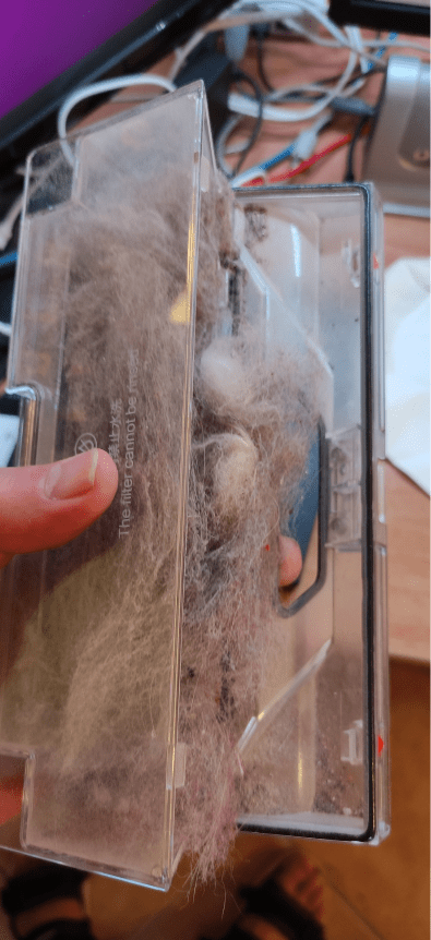 I can also show you the video I made for you of it’s second living room cleanup (once we figured out how to open the filter box – simple) – and this photo of the results – clumps of cat hairs and all sorts of stuff – needless to say my recently reviewed air duster made short work of that mess and dry-cleaned the non-washable filter A TREAT.